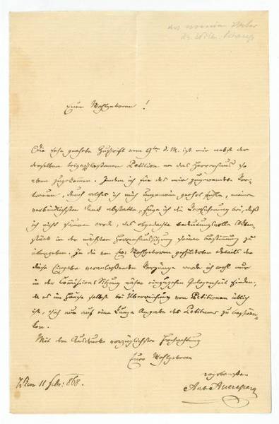 1 S. 8vo. An einen namentlich nicht genannten Adressaten: "Die sehr geehrte Zuschrift [.] ist mir nebst der derselben beigeschlossenen Petition an das Herrenhaus so eben zugekommen. Indem ich für das mir zugewandte Vertrauen, durch welches ich mich ungemein geehrt fühle, meinen verbindlichsten Dank abstatte, füge ich die Versicherung bei, daß ich nicht säumen werde, das obgedachte bedeutungsvolle Aktenstück in der nächsten Herrenhaussitzung seiner Bestimmung zu übergeben [.]".