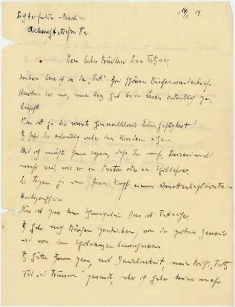 1½ SS. auf Doppelblatt. 8vo. An die Schriftstellerin Lisa Tetzner (1894-1963): "Soeben lese ich in der 'Tat' Ihre schönen Märchenwanderbriefe. Erlauben Sie mir, mein Herz hat beim Lesen ordentlich gehüpft. Das ist ja die reinste himmelblaue Erdenhaftigkeit! Ich sehe Sie ordentlich unter den Kindern sitzen. Und ich möchte Ihnen sagen, daß Sie mehr, tausendmal mehr sind, wie so ein Pastor oder ein Schullehrer. Sie tragen ja um Ihren Kopf einen schmetterlingshaften Heiligenschein [.]". - Mit kleinen Ausrissen am linken Rand (geringf. Textberührung).