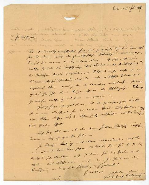1¼ SS. auf Doppelblatt. 4to. Mit eh. Adresse (Faltbrief). An Joseph Schreyvogel (1768-1832), Hoftheatersekretär und Dramaturg am k.k. Hoftheater: "Ew. Wohlgeboren bin ich unendlich verpflichtet für das geneigte Schreiben vom 24. Jan: u. erkenne ganz die freundschaftlichen Gesinnungen mit welcher sie sich für meine Werke interessieren. Ich sehe wohl ein welche Gründe die Aufführung des Isidor - des Deutschthums u. der Gastlichen Treue verhindern, u. bescheide mich. Daher ich nur die geneigte Zurücksendung durch die erste [.] Gelegenheit ergebenst bitte. Was jedoch den Camillus anbetrifft - so werde ich die Ehre haben beim Kürzen Ihnen die Abkürzungen bekandt [!] zu machen welche ich mithin vorgenommen. [.] Auch sagen Sie mir ob Sie den Gustav Adolph aufführen können - doch ich zweifle fast. [.]". - Friedrich Graf von Kalckreuth, der unter dem Pseudonym Felix Marius publizierte, ist vor allem als Mäzen und Gesellschafter des spätromantischen "Dresdner Liederkreises" um Carl August Böttiger und Friedrich Kind bekannt. Auch Böttigers Gegenspieler Ludwig Tieck zählte zu Kalckreuths Freunden. - Mit kleinem Ausriss durch Siegelbruch.