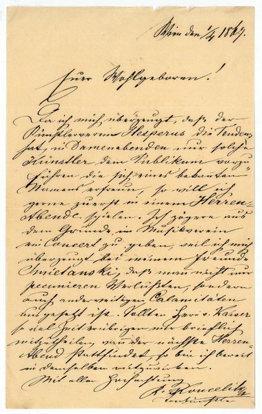 1 S. Gr.-8vo. An einen namentlich nicht genannten Adressaten: "Da ich mich überzeugt, daß der Künstlerverein Hesperus die Tendenz hat, in Damenabenden nur solche Künstler dem Publikum vorzuführen, die sich eines bekannten Namens erfreuen, so will ich gerne zuerst in einem Herren-Abende spielen. Ich zögere aus dem Grunde, im Musikverein ein Concert zu geben [.]". - Richard Concelli war Mitglied des Kgl. Hoftheaters Stuttgart und schied 1878 aus dessen Verband aus. - Mit kleinen Läsuren am oberen Rand.