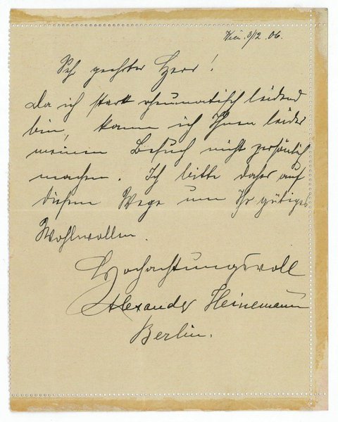 1 S. 8vo. Mit eh. Adresse (Kartenbrief). An einen Herrn Horn in Wien: "Da ich stark rheumatisch leidend bin, kann ich Ihnen leider meinen Besuch nicht persönlich machen. Ich bitte daher auf diesem Wege um Ihr gütiges Wohlwollen [.]". - Alexander Heinemann studierte Klavier und Violine und ließ sich im Gesang ausbilden, erhielt Unterricht bei Adolf Schulze und spezialisierte sich auf den Konzertgesang. "Seit 1895 trat er in Berlin auf, später in ganz Deutschland und in Europa, vor allem in den Niederlanden und in Skandinavien. 1906-10 gastierte er in Wien, 1911-13 in Nordamerika. Heinemann arbeitete auch als Gesangspädagoge und unterrichtete am Sternschen Konservatorium in Berlin mehrere Jahre lang eine Vokalklasse. Zu seinen Schülern gehörte Joseph Schwarz" (DBE).
