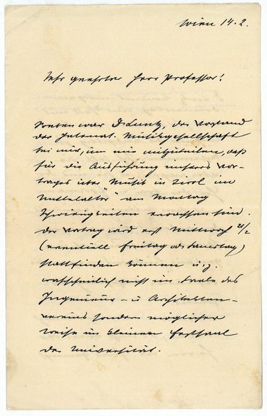 3 SS. auf Doppelblatt. Gr.-8vo. An einen namentlich nicht genannten Adressaten: "Soeben war Dr. Luntz, der Vorstand der Internat. Musikgesellschaft bei mir, um mir mitzuteilen, daß für die Ausführung unseres Vortrages über 'Musik in Tirol im Mittelalter' am Montag Schwierigkeiten erwachsen sei[e]n. Der Vortrag wird erst Mittwoch 21/2 (eventuell Freitag oder Samstag) stattfinden können u. z. wahrscheinlich nicht im Saale des Ingenieur- u. Architektenvereins sondern möglicherweise im kleinen Festsaal der Universität [.]". - Zunächst Mittelschullehrer in Kremsier, unterrichtete Koller seit 1893 an der Staatsgewerbeschule in Wien. 1892 war er an der Wiener Musik- und Theaterausstellung beteiligt und wirkte an den bibliographischen Vorbereitungen der Denkmäler der Tonkunst in Österreich mit, deren wirkendes Mitglied er seit 1893 war und deren leitender Kommission er angehörte. "1898-1902 war er erster Bibliothekar am neugegründeten Musikhistorischen Institut der Univ. Wien. Mit seinen musikhistorischen Studien für die 'Vierteljahresschrift für Musikwissenschaft' (u. a. 'Der Liederkodex von Montpellier', 1888) zählt Koller zu den Pionieren der Mediävistik in der Musikwissenschaft" (DBE).