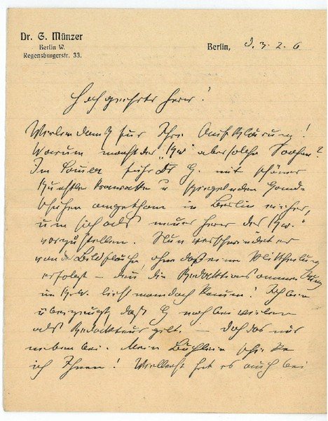 2½ SS. auf Doppelblatt. Gr.-8vo. An einen namentlich nicht genannten Adressaten über die Kapricen eines "Dr. G." und sein Buch "Wunibald Teinert": "[.] Mein Büchlein schicke ich Ihnen! Vielleicht hat es auch bei Ihnen Glück und Sie erweisen [?] dem Helden ein wehmütiges Lächeln! Wunibald ist ein Jugendgenosse von mir u. sein tragisches Geschick ist unter der Maske des Humors geschildert. Es giebt Menschen, die lächeln - krampfhaft lächeln, um nicht zu schreien u. zu stöhnen [.]". - Auf Briefpapier mit gedr. Briefkopf.