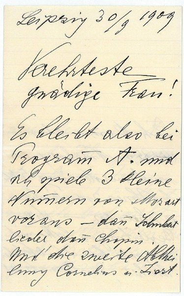 4 SS. 8vo. An eine namentlich nicht genannte Adressatin bezüglich eines bevorstehenden Konzertes: "Es bleibt also bei Programm A. und ich spiele 3 kleine Nummern von Mozart voraus - dann Schubert, dann Chopin. Und die zweite Abtheilung Cornelius und Liszt". - Josef Pembaur Jr. erhielt seinen ersten Musikunterricht bei seinem Vater Josef Pembaur d. Ä., studierte dann Klavier an der Münchner Akademie für Tonkunst und wurde dort Lehrer. Seit 1901 zu Studien in Leipzig, wurde er nach anhaltenden Erfolgen als Konzertpianist 1912 als Professor an das dortige Konservatorium berufen. Pembaur widmete sich vor allem den Werken Ludwig van Beethovens, Robert Schumanns, Franz Liszts und Frédéric Chopins.
