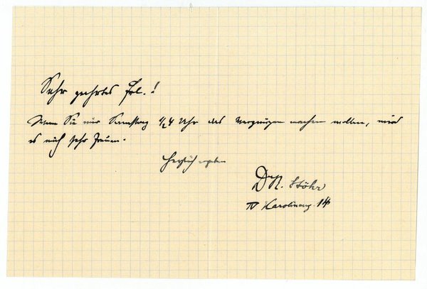 1 S. Qu.-8vo. An eine namentlich nicht genannte Adressatin: "Wenn Sie mir Samstag ½4 Uhr das Vergnügen machen wollen, wird es mich sehr freuen […]". - Seit 1904 unterrichtete Stöhr Harmonie, Kontrapunkt und Formenlehre an der Staatsakademie für Musik und darstellende Kunst in Wien, wurde 1926 Regierungsrat und erhielt 1930 den Professorentitel. Nach dem "Anschluß" Österreichs 1938 emigrierte er in die USA, lehrte 1939-41 am Curtis Institute of Music in Philadelphia, 1942/43 am Cincinnati Conservatorium in Ohio und war 1942-50 Professor am St. Michael's College in Winooski, Vermont.