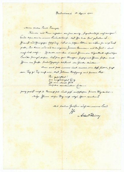 ¾ S. 4to. An den Schauspieler Paul von Pranger (1888-1961): "[…] Heute lesen wir in einem Freundschaftsbriefe, dass Ihre liebe Frau gestorben ist. Ich weiß aus schmerzlicher Erfahrung, dass es in solchen Fällen von außen her nicht Trost giebt […]". - Albert Heine nahm Schauspielunterricht bei Heinrich Oberländer, wurde Mitglied im Ensemble des kgl. Schauspielhauses und war vorwiegend in Charakterrollen zu sehen. Nach zwei Jahren in München kam er 1910 ans Wiener Burgtheater, dem er von 1918 bis 1921 auch als Direktor vorstand. Ihm ist die erste deutsche Inszenierung von "Peer Gynt" zu verdanken, auch leitete er 1905 als Regisseur die Uraufführung von Wedekinds "Büchse der Pandora" in Wien und führte 1932 Regie bei der Erarbeitung des "Tasso" in Weimar; 1936 wurde er zum Ehrenmitglied des Burgtheaters ernannt.