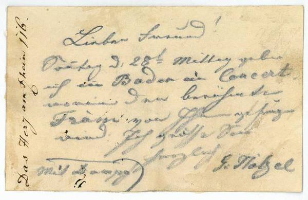 70:115 mm. An einen Freund: "Sonntag d. 28ten Mittag gebe ich in Baden ein Concert […]". - Alte Montagespuren auf der Verso-Seite. - Der Sohn des Sängers und Schauspielers Alois Hölzel bereiste als als Opern- und Konzertsänger ganz Deutschland; "er ließ sich kurze Zeit zu Gesangsstudien in Paris nieder und war 1838-40 in Zürich engagiert. 1840-63 am Kärntnerthor-Theater in Wien, wo er wegen einer Textänderung in der Oper "Templer und Jüdin' entlassen wurde" (ÖBL II, 360). Später wirkte er in Darmstadt, London, St. Petersburg, Stockholm und Nürnberg sowie 1866 am Theater an der Wien. "Am 21. 6. 1868 sang Hölzel unter Richard Wagner in München den ersten Beckmesser" (ebd.).
