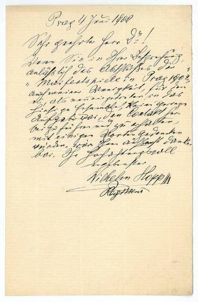 ¾ S. 8vo. Wenn Sie in Ihrer Besprechung anlässlich des Abschlußes der ‚Maifestspiele in Prag 1902', auch meiner Wenigkeit […] mit einigen Worten gedenken würden, wäre Ihnen äußerst dankbar […]". - Gefaltet.