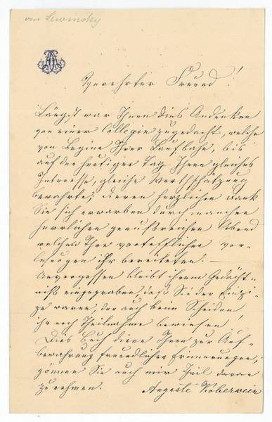 1 S. auf gefalt. Doppelblatt. 8vo. An den Schauspieler Josef Lewinsky (1835-1907): "Längst war Ihnen dies Andenken von einer Collegin zugedacht, welche von Beginn Ihrer Laufbahn, bis auf den heutigen Tag Ihnen gleiches Interesse, gleiche Wertschätzung bewahrte; deren herzlichen Dank Sie sich erwarben durch manchen herrlichen genussreichen Abend welchen Ihre vortrefflichen Vorlesungen ihr bereiteten. Unvergessen bleibt ihrem Gedächtnis eingegraben, daß Sie der Einzige waren, der auch beim Scheiden, ihr noch Theilnahme bewiesen! Dies Buch diene Ihnen zur Aufbewahrung freundlicher Erinnerungen, gönnen Sie auch mir Theil daran zu nehmen […]". - Die Tochter des Schauspielers Heinrich Anschütz erhielt ihre Ausbildung bei ihrem Vater und spielte bereits 1831-35 Kinderrollen am Wiener Burgtheater, wo sie schließlich als jugendliche Liebhaberin auftrat. 1836-37 war Koberwein am Stadttheater von Leipzig engagiert, wirkte 1837 am Hoftheater in Dresden und gehörte dann bis 1871 zum Ensemble des Wiener Burgtheaters. - Auf Briefpapier mit gedr. Monogramm.