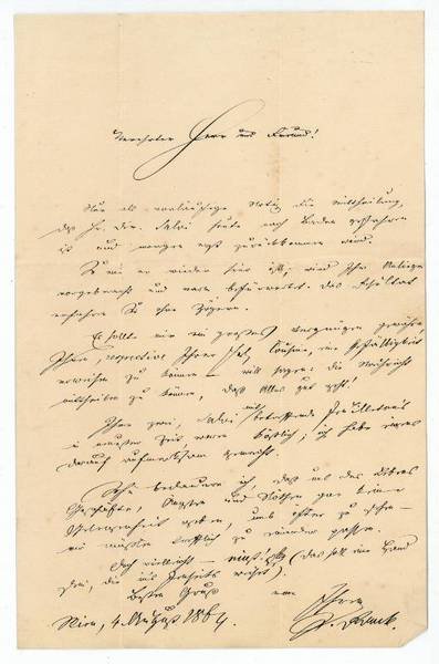 1 S. auf Doppelblatt. Gr.-8vo. An einen namentlich nicht genannten Adressaten: "Nur als vorläufige Notiz die Mittheilung daß Hr. Dir. Salvi heute nach Baden gefahren ist und morgen erst zurückkommen wird. So wie er wieder hier ist, wird Ihr Anliegen vorgebracht und warm befürwortet. Das Resultat erfahren Sie ohne Zögern. Es sollte mir ein großes Vergnügen gewähren, Ihnen, respective Ihrer Frl. Cousine, eine Gefälligkeit erweisen zu können, daß Alles gut geht! [.]". - Der in Friedrichsthal im Böhmerwald geborene und zu Wien verstorbene Autor war ursprünglich für den geistlichen Beruf bestimmt, begann aber 1836 in Wien zu studieren. Seit 1838 sich zur Gänze seiner schriftstellerischen Tätigkeit widmend, wurde Rank insbesondere durch seinen Erzählband "Aus dem Böhmerwalde" (1843) bekannt. Auf Grund von Schwierigkeiten mit der Zensur wegen seiner Zugehörigkeit zur jungösterreichischen Bewegung ging er 1845 für einige Zeit nach Leipzig, 1848 wurde er Mitglied des Frankfurter Parlaments, schloß Freundschaft mit Ludwig Uhland und verkehrte im Kreis um Justinus Kerner und Gustav Schwab. In den fünfziger Jahren in Frankfurt a. M. und Weimar lebend, gab Rank von 1855 bis 1857 das "Weimarer Sonntagsblatt" heraus. 1861 wieder nach Österreich zurückgekehrt, wurde er Redakteur der "Österreichischen Zeitung", war von 1865-74 Direktionssekretär der Hofoper in Wien und hielt daneben Vorträge über Ästhetik und Geschichte an der Hofopernschule. 1876-78 war er Generalsekretär des Wiener Stadttheaters und 1882/83 verantwortlicher Redakteur der von Ludwig Anzengruber herausgegebenen belletristischen Zeitschrift "Heimat". Seine 1896 von August Sauer herausgegebenen "Erinnerungen" "entwerfen ein lebendiges Bild der Vormärzzeit" (DBE; vgl. auch Kosch III, 2157).