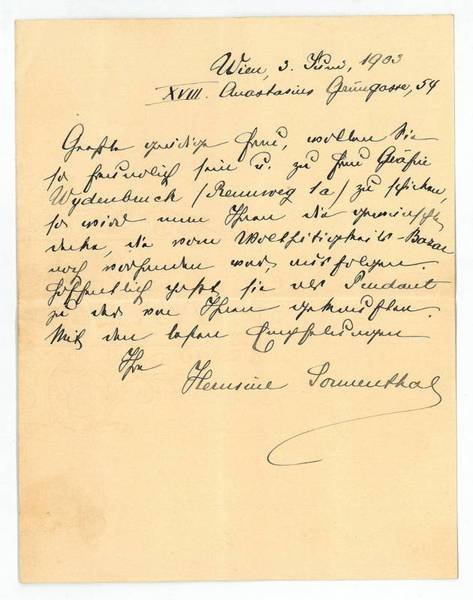 1 S. auf gefalt. Doppelblatt. 8vo. Mit eh. Briefumschlag. An Emilie Schaup aus der Zipfer-Brauereidynastie: "[…] wollen Sie so freundlich sein u. zu Frau Gräfin Wydenbruck / Rennweg 1a / zu schicken, so wird man Ihnen die gewünschte Decke, die vom Wolthätigkeits-Bazar noch vorhanden war, ausfolgen. Hoffentlich passt sie als Pendant zu der von Ihnen gekauften […]".