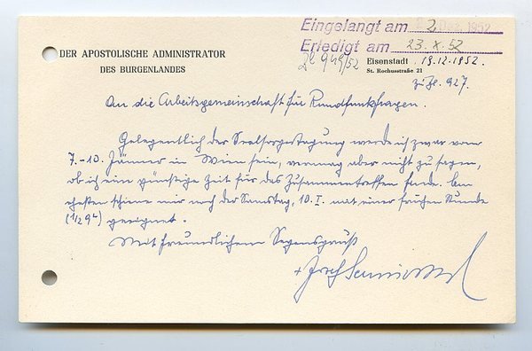 1 S. Qu.-8vo. An die Arbeitsgemeinschaft für Rundfunkfragen: "Gelegentlich der Seelsorgertagung werde ich zwar von 7. bis 10. Jänner in Wien sein, vermag aber nicht zu sagen, ob ich eine günstige Zeit für das Zusammentreffen finde [.]". - Josef Schoiswohl war nach dem Zweiten Weltkrieg zum Apostolischen Administrator des Burgenlandes ernannt worden und leistete als solcher "wichtige Vorarbeiten für den Aufbau einer eigenständigen Diözese Eisenstadt. 1954-68 war Schoiswohl Bischof von Graz-Seckau. 1969 wurde er Titularerzbischof von Monteverde. [Er] setzte sich nachdrücklich für den Dialog zwischen Kirche und Gesellschaft ein und förderte in seiner Diözese das Laienelement. Nach seinem Rücktritt aus Altersgründen wirkte er als Seelsorger in der Zisterzienserabtei Neukloster in Wiener Neustadt, danach in Guntramsdorf" (DBE). - Auf Briefpapier mit gedr. Briefkopf; im linken Rand gelocht (keine Textberührung).