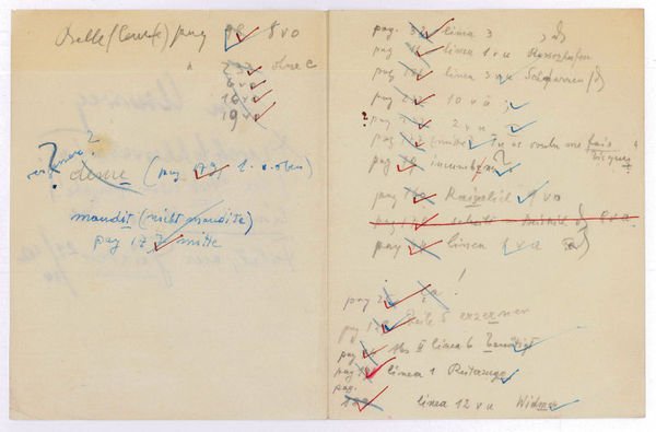 3 SS. auf Doppelblatt. Kl.-8vo. Betitelt "Ein Umweg. Druckfehlerverzeichnis (der Beck'schen Ausgabe!) eingesandt von der Fahrt, aus Güsten 21. IV. 42". - Doderers Roman "Ein Umweg" war zuerst 1940 bei Beck in München erschienen. - In Bleistift, blauer und roter Tinte; leicht gebräunt und fleckig.