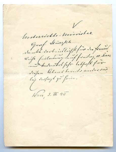 ¾ S. Kl.-4to. Unterrichts-Minister | Graf Stürgkh | dankt verbindlichst für die freundliche Einladung auf Freitag, 10. März und bedauert sehr lebhaft für diesen Abend bereits anderwärtig versagt zu sein. - Von 1909 bis 1911 österreichischer Unterrichtsminister, wurde Karl Gf. Stürgkh 1911 von Kaiser Franz Joseph zum Ministerpräsidenten bestellt. Er suspendierte 1913 den böhmischen Landtag, vertagte 1914 den Reichsrat und regierte seitdem autoritär mit Notverordnungen, seit Kriegsbeginn mit Ausnahmeverfügungen für den Kriegsfall. Er weigerte sich, das Parlament wiedereinzuberufen, und setzte eine rigorose Pressezensur durch. Stürgkh wurde von Friedrich Adler, dem Sohn Victor Adlers, erschossen. - Papierbedingt leicht gebräunt.
