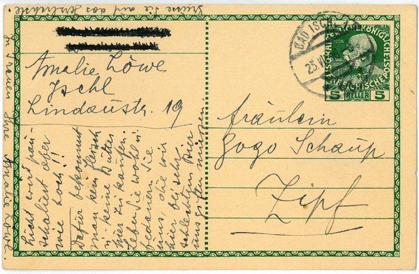 1½ SS. 8vo. Informiert Emilie Schaup über eine verloren gegangene Sendung. - Amalie Löwe war die Ehefrau des Dirigenten Ferdinand Löwe (1865-1925).