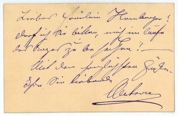 1 S. (5 Zeilen). 72:113 mm. An ein Fräulein Hamburger: "Darf ich Sie bitten, mich im Laufe des Tages zu besuchen? […]". - Friedrich-Materna war zunächst Operettensoubrette am Thalia-Theater in Graz und am Carl-Theater in Wien, 1869-94 als dramatische Sängerin Ensemblemitglied der Wiener Hofoper. Vor allem als Wagner-Interpretin bekannt, sang sie mehrmals bei den Bayreuther Festspielen. Am Ende ihrer Bühnenkarriere trat Materna als Konzertsängerin auf und wirkte zuletzt als Gesangspädagogin in Graz.
