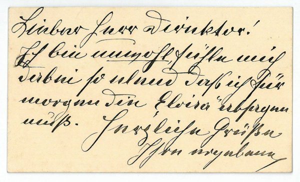 1 S. Visitkartenformat. An den namentlich nicht genannten Direktor der Wiener Hofoper Wilhelm Jahn (1835-1900): "Ich bin unwohl, fühle mich dabei so elend daß ich für morgen die 'Elvira' absagen muß [.]". - Die Tochter Maria Theresia Lehmann-Löws debütierte 1867 am Leipziger Opernhaus. Weitere Engagements führten sie nach Hamburg, Köln und Prag. 1881 kam sie an die Wiener Hofoper, deren Mitglied sie bis 1896 war.