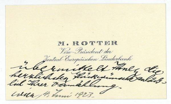 57 x 95 mm. Mit eh. adr. Umschlag. An Hans Nüchtern: "[M. Rotter | Vize-Präsident der Zentral-Europäischen Länderbank] übermittelt Ihnen die herzlichsten Glückwünsche anlässlich Ihrer Vermählung". - Der aus Wien stammende Journalist und Dramaturg Hans Nüchtern (1896-1962) war seit 1924 Leiter der literarischen Abteilung der RAVAG und unterrichtete auch an der Akademie für Musik und darstellende Kunst sowie am Max Reinhardt-Seminar.