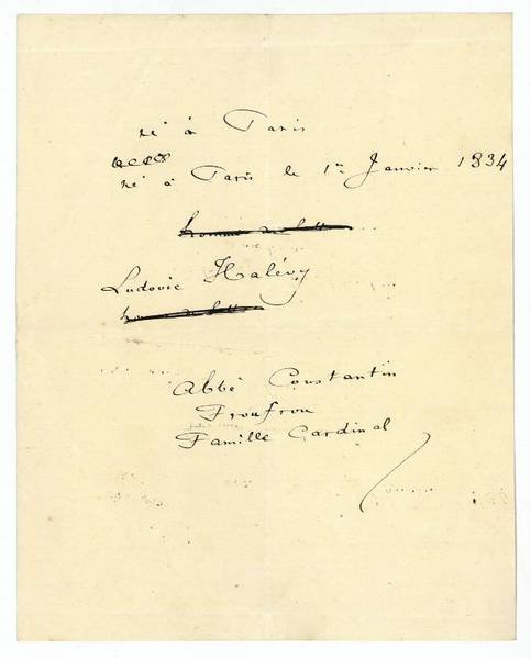 1 S. 4to. Gewidmet einem Abt Constantin Fronfron. "Né à Paris le 1. Janvier 1834 […]". - Gefaltet. - Der Sohn des Schriftstellers Léon Halévy wurde bekannt als Verfasser der Libretti zu den Jacques Offenbachschen Burlesken, die er z. T. gemeinsam mit Henri Meilhac verfaßte.
