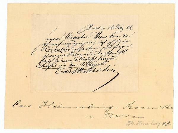 80 x 110 mm. Auf Trägerkarton montiert. Herrn Alexander Hesse beeile ich mich anzuzeigen, dass ich sein Circulair erhalten und füge ich meine Namensunterschrift auf seinen Wunsch hinzu […]. - Helmerding debütierte als Berufsschauspieler 1847 in Meißen und spielte lange Zeit Intriganten und Charakterrollen, bis er das komische Fach für sich entdeckte. Über Bühnen in Sondershausen, Erfurt und Köln kam er 1855 ans Wallner-Theater in Berlin, wo er in rund zwei Jahrzehnten und in über 100 Stücken zum Weltruhm der Berliner Lokalposse wesentlich beitrug.