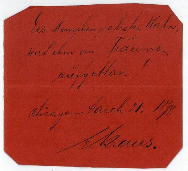 1 S. 12mo. Des Menschen wahrster Wahn, wird ihm im Traume aufgethan!. - Kraus debütierte 1893 debütierte am Hoftheater in Mannheim, sang 1896-98 bei der Damrosch Opera Company in den USA und kam danach an die Berliner Hofoper, wo er bis 1924 als Kgl. Kammersänger blieb. - An den Ecken beschnitten; mit alten Montagespuren auf der Verso-Seite.