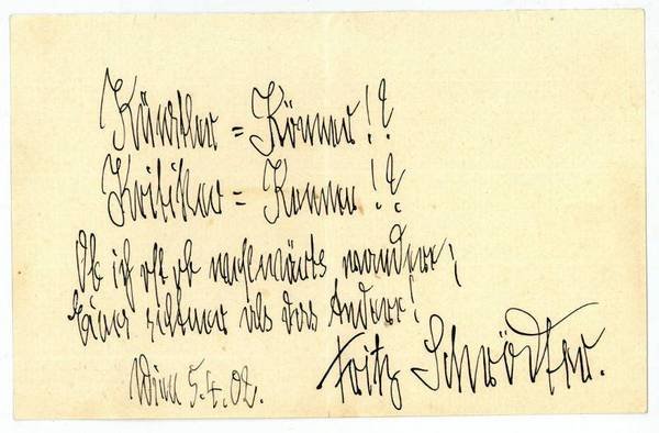 1 S. Qu.-8vo. Künstler = Könner!? Kritiker = Kenner!? [.]. - Gefaltet. Der aus Leipzig stammende Sänger studierte in Köln, debütierte in Berlin und sang von 1885 bis 1915 im Ensemble der Wiener Hofoper. Zu seinen wichtigsten Partien zählten u. a. David, Max, Turridu, Canio, Eisenstein, Loge, Pinkerton und Hoffmann.