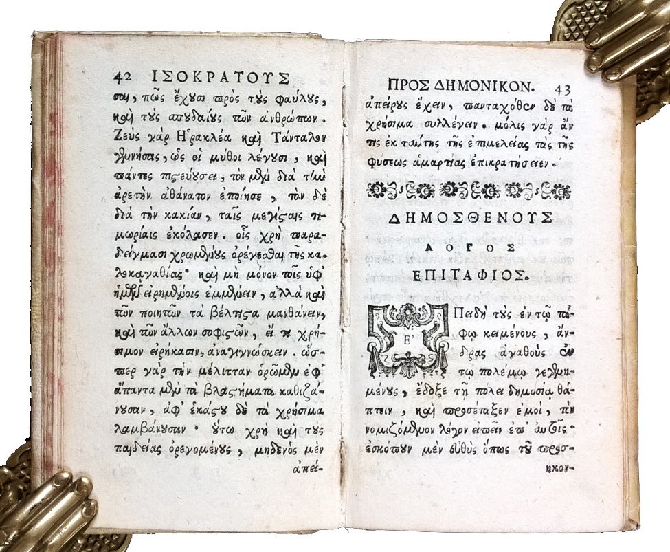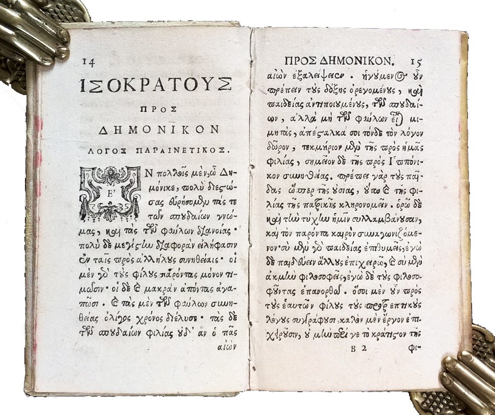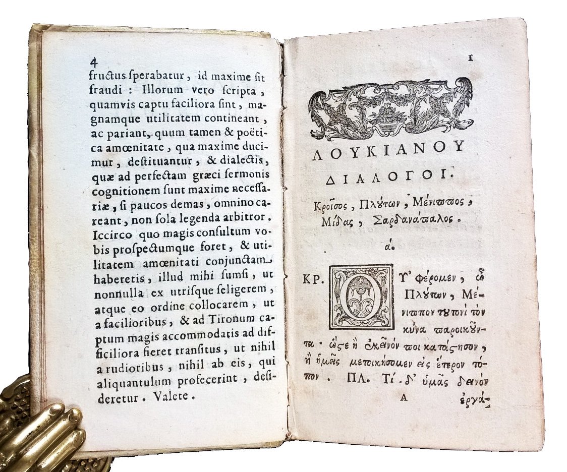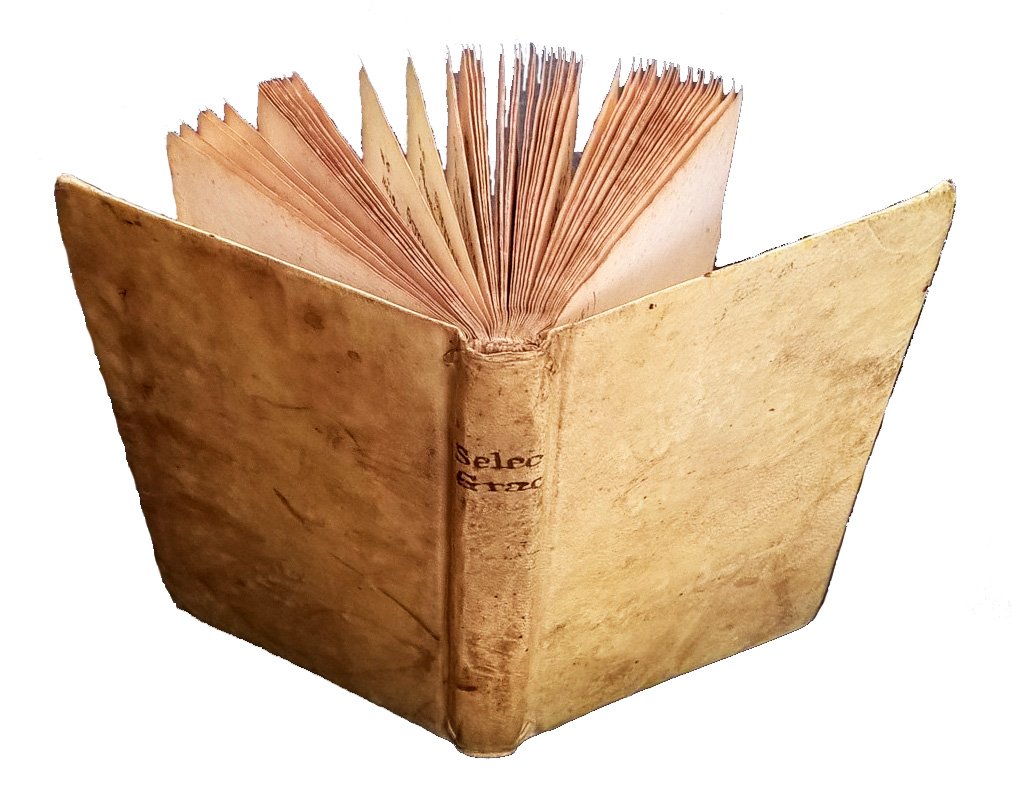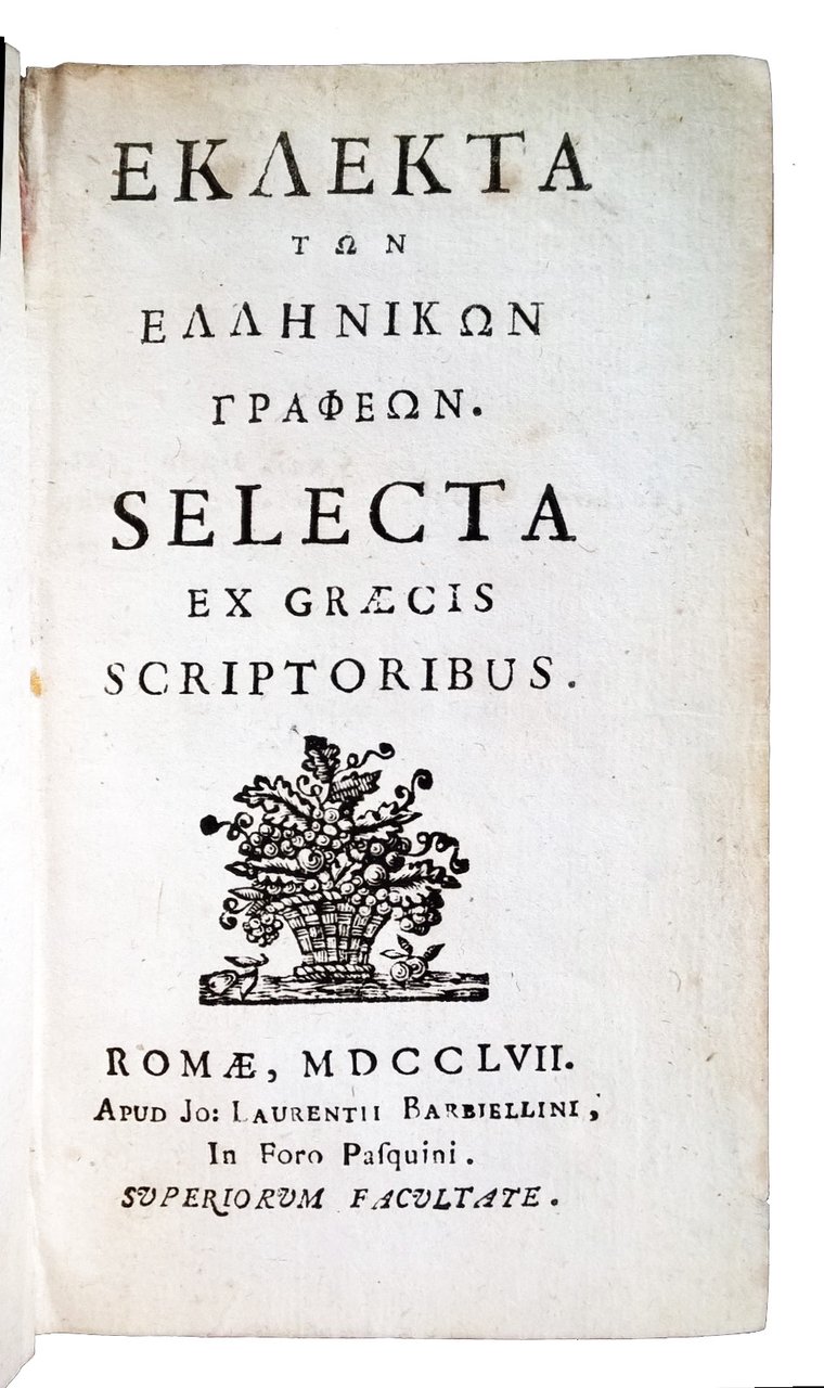 in-12°, 150x64 mm, leg. coeva in piena pergamena rigida, titolo manoscritto al dorso, tagli spruzzati di rosso; pp. 4, 118, [2]. Fregio xilogr. sul front.; iniziali e finalini xilografici. Rara raccolta di testi in Greco, estratti da Loukianos, Isokrates, Demosthenes, Thoukydides, epigrammatists, Anakreon, Pindaros, Theokritros; introduzione in Latino. Rif.: IT\ICCU\TO0E\026101 (4 copie presso le Biblioteche Italiane). OCLC, 955941467. Cond.: Presenza di una macchia su un piatto della legatura. Rare bruniture alle carte. Opera nel complesso molto buona.