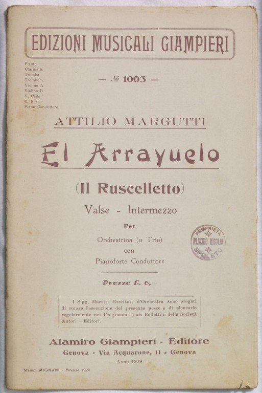 In 8. cm 27x18. Pp. 11. Partitura completa per orchestra del 1929 di una canzone. Caratteristica copertina decorata dell'epoca. Ex libris sulla copertina. Buone condizioni; usure e strappi al dorso; fioriture in copertina. A complete score for orchestra of 1929. Carachteristic decorated cover of that period. Ex libris in the cover. Good conditions, worn spine with tears; brownings in the cover.