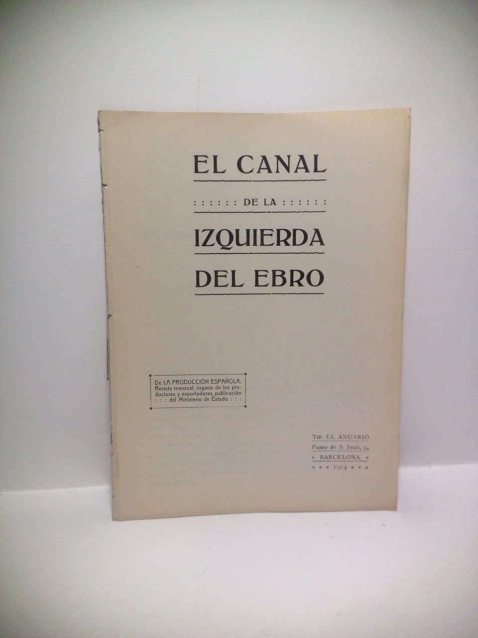 Barcelona: Tip. El Anuario, 1914.- 22 p.; 4º menor (20,1 x 14,8 cm); Cubiertas provisionales.- (De La Producción Nacional, Revista mensual, órgano de los productores y exportadores, publicación del Ministerio de Estado).* Falto de las cubiertas originales, que han sido sustituidad por otras de papel. OBRAS HIDRÁULICAS Y RIEGOS