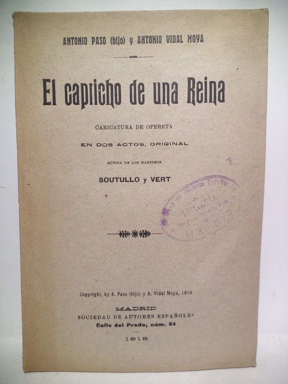 El capricho de una reina. (Caricatura de opereta en dos actos. Estrenada en el Teatro de Apolo, el día 17 de mayo de 1919) / Música de los maestros Soutullo y Vert