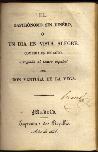 El gastrónomo sin dinero ó Un día en Vista Alegre. Comedia en un acto arreglada al teatro español por .
