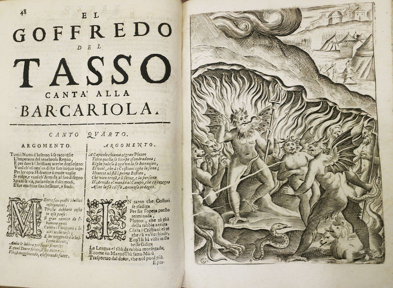 In-8 p. (mm. 228x165), p. pergamena coeva, tit. ms. al dorso, tagli azzurri, 2 cc.nn. (frontesp. e l'Auttor al libro), 345,(3) pp.num., vignetta xilografata al frontespizio, testo originale a fronte, ornato da grandi iniziali e finali, pure inc. su legno. Questa edizione è molto ben illustrata da 20 tavole inc. in rame da Giacomo Valeggio e Francesco Valesio, poste all'inizio di ogni canto. "Manca l'antiporta" di Isabella Piccini. "Seconda edizione" della traduzione in veneziano del Mondini (la prima è del 1693), con bella provenienza: al risguardo firma autografa di Giaco Soranzo, senatore e bibliofilo veneziano, datata 1730. Cfr. Raccolta Tassiana della Biblioteca A. Mai di BG, 733.Antico restauro alle prime 2 carte per mancanza al marg. infer. bianco; alc. tavole pure leggerm. più corte in calce, altrimenti esemplare ben conservato.