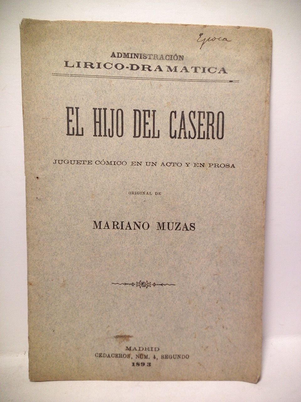 [PRIMERA EDICION].- Madrid: [Eduardo Hidalgo, Ed.] (R. Velasco, Imp.), 1893.- 31 p.; 8º mayor (19,5 x 13,1 cm).- (Administración Lírico-Dramática).* Dedicatoria autógrafa del autor en la portadilla a D. Pedro Bofill. TEATRO ESPAÑOL DE LOS SIGLOS XIX-XXI