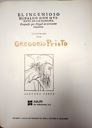 El Ingenioso Hidalgo Don Quijote de la Mancha. Tomo II. Homenaje a Miguel de Cervantes por Gregorio Prieto. Revisión y notas de Federico de Onis y Antonio G. Solalinde. Dedicatoria al conde de Lemos.