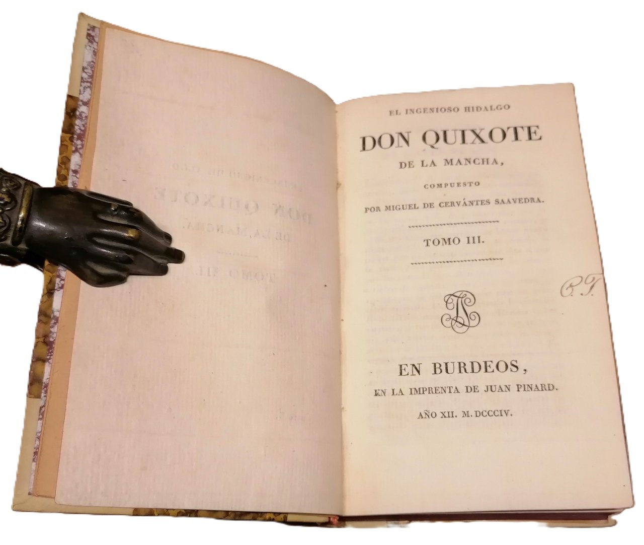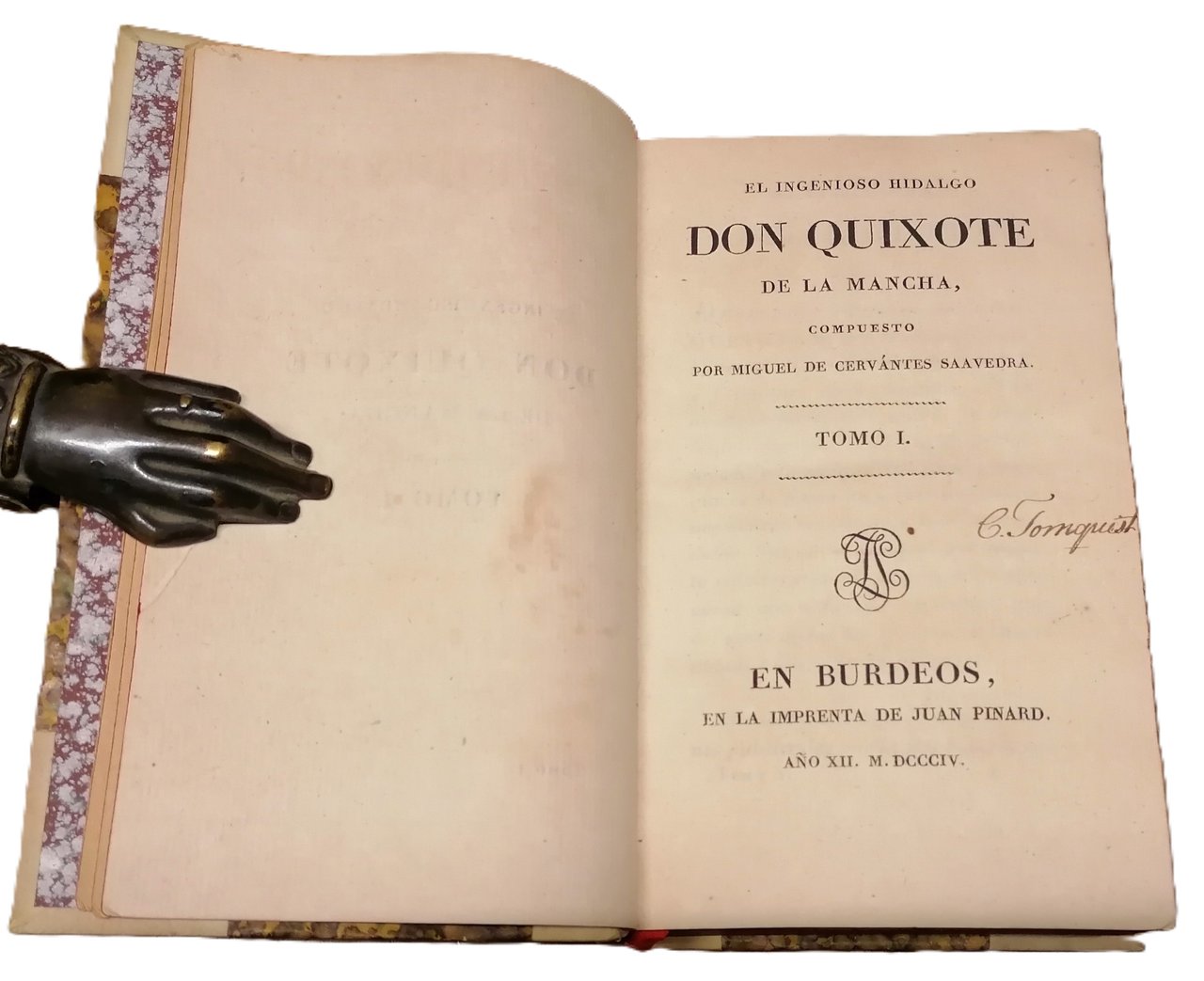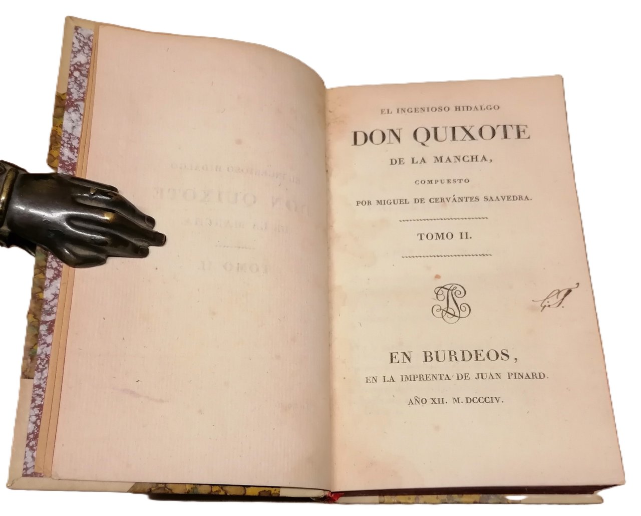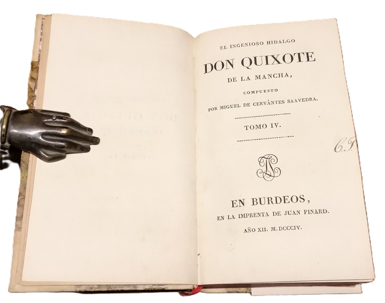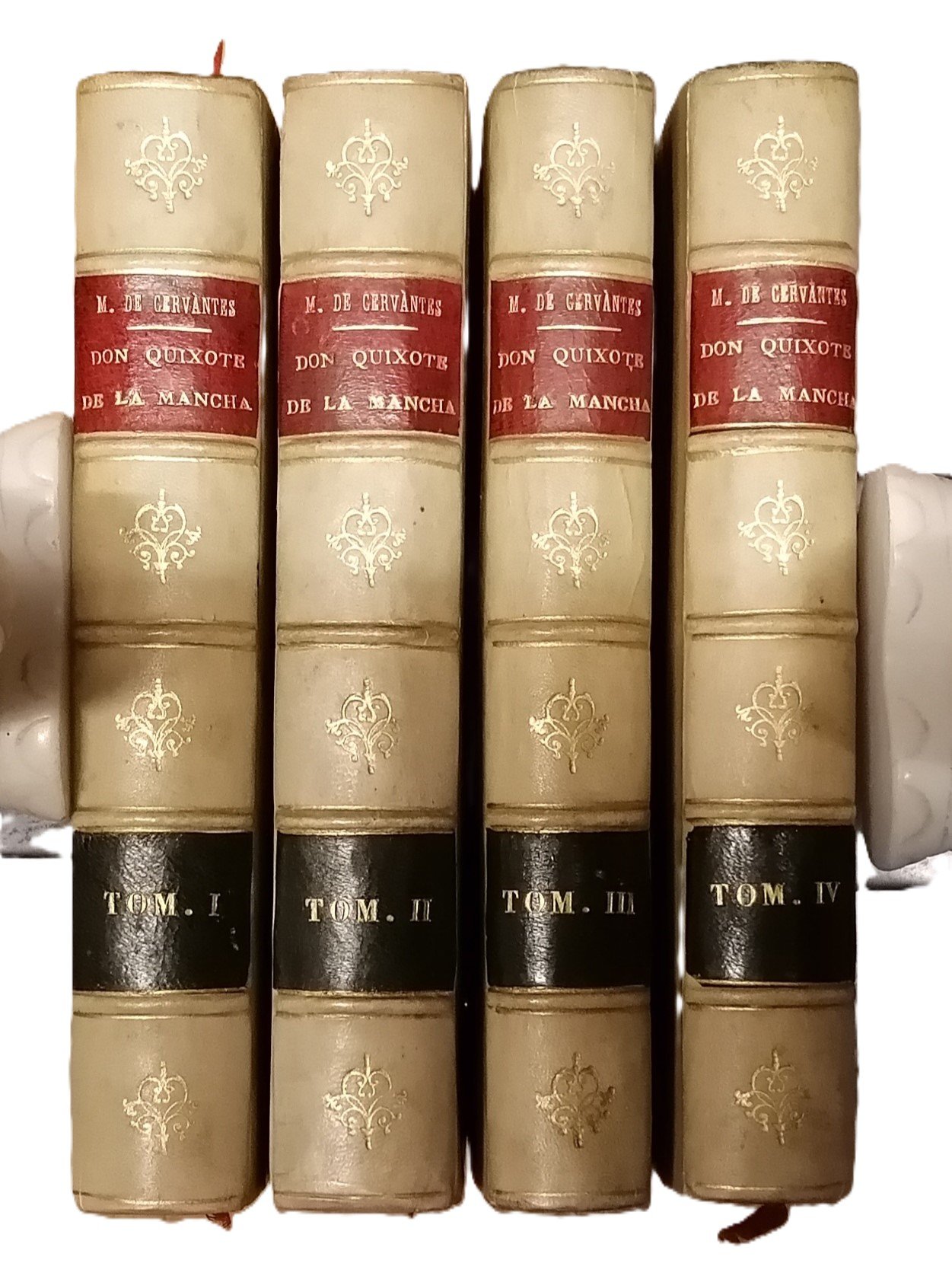 (Letteratura spagnola) Quattro volumi in 12° (cm 16,5 x 10), legatura in mezza pergamena con punte, dorso a 5 nervi con fregi dorati, doppio tassello in pelle rosso e nera con titoli in oro, carta marmorizzata ai piatti, tagli in colore rosso, pp. (4),XLVI,328 ; 432 ; XI,(1),382 ; 438. Nel primo volume precede il testo la "Noticia de la vida y de las obras de Cervantes" di Manuel José Quintana. Anno XII del Calendario repubblicano (1804). Vecchia firma ai frontespizi. Alla pagina 35 del volume quarto piccola mancanza al margine bianco di piede, peraltro volumi in ottimo stato di conservazione.