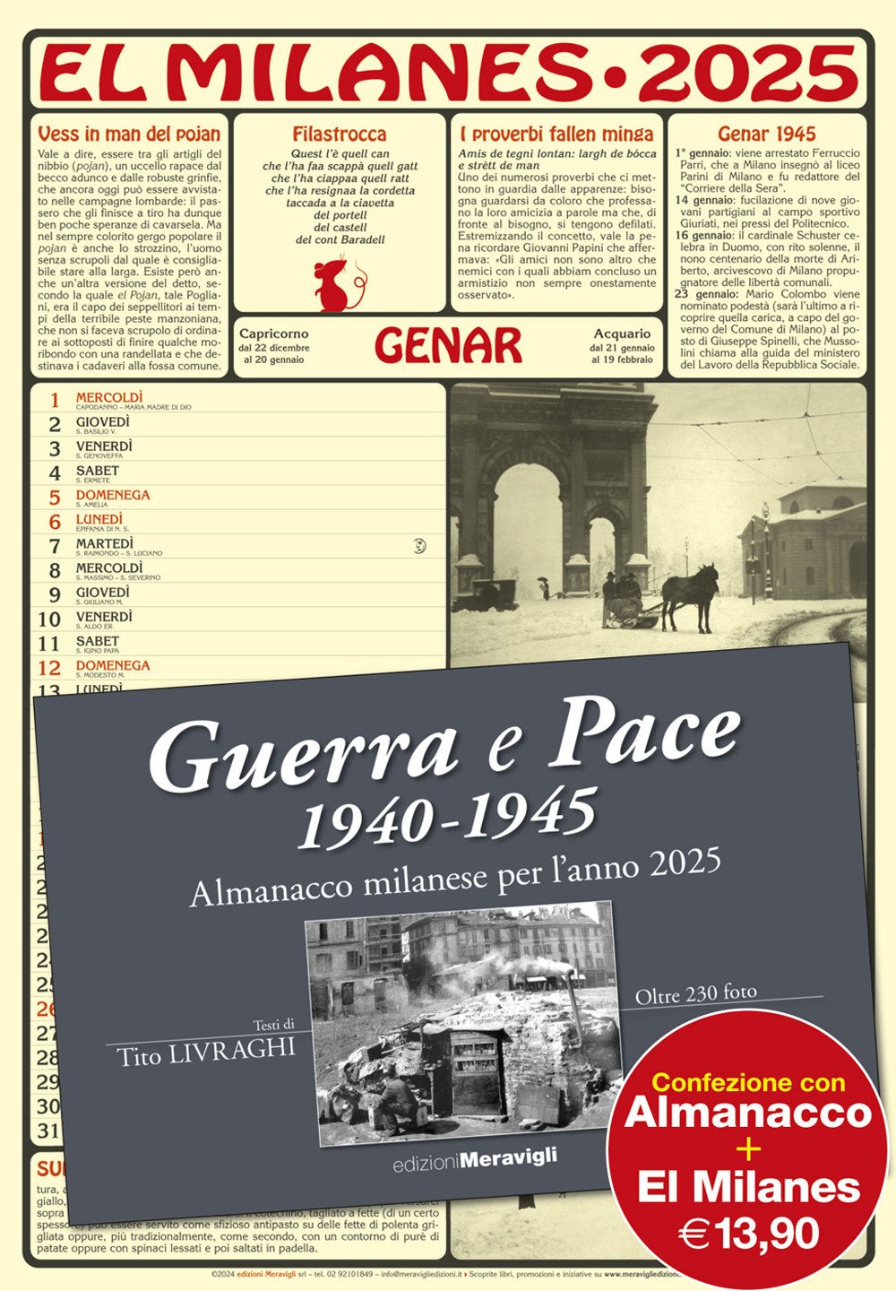 L'autentico calendario meneghino di grande formato (da appendere). Proverbi, filastrocche, modi di dire, episodi del passato e ricette tipiche, oltre a rare e suggestive foto d'epoca della città (2 per ogni mese) accompagnano il cultore della Milano che fu, giorno dopo giorno. In abbinamento a "El Milanes" l'immancabile "Almanacco milanese 2025", preziosa pubblicazione da collezione (112 pagine) che quest'anno è dedicata all'ottantesimo anniversario della Liberazione (25 Aprile 1945) con una straordinaria carrellata di scatti (oltre 230) della città ferita dalle bombe corredati da testi del noto medico scrittore milanese Tito Livraghi.