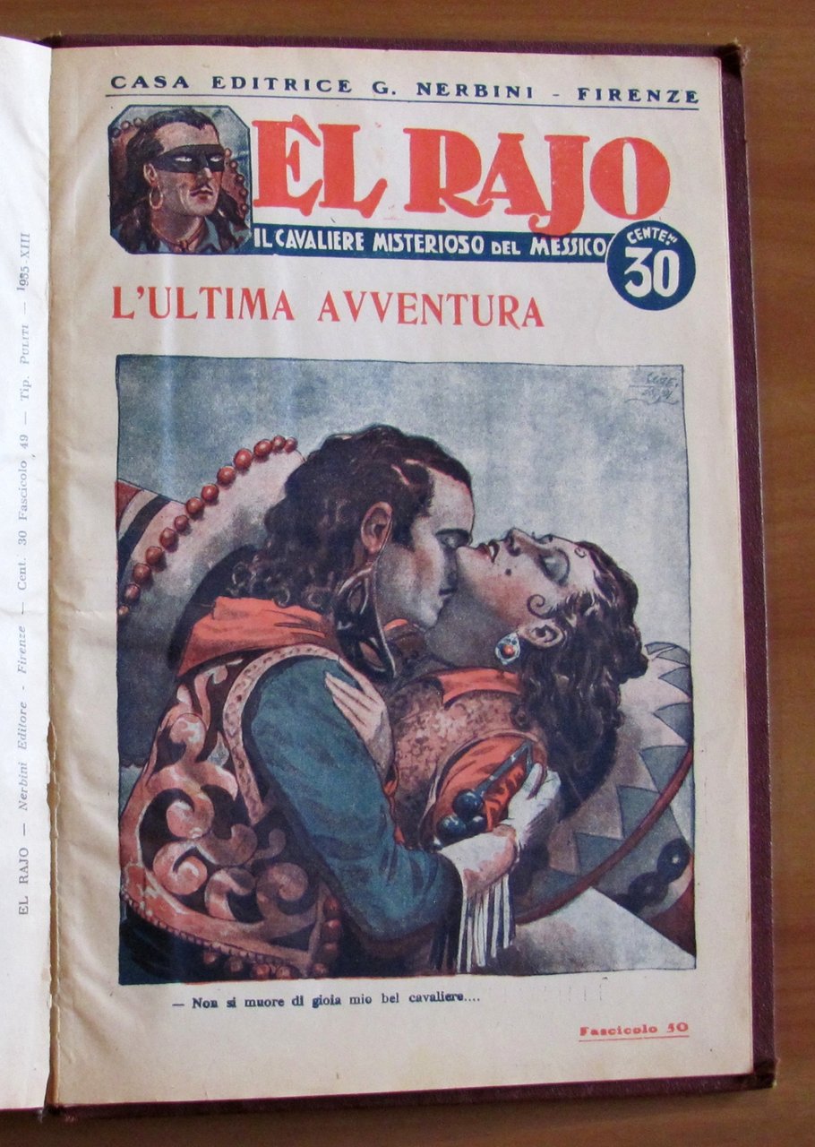 50 belle copertine a colori di Giove Toppi. Casa Editrice Nerbini - Firenze, 1934-35. Raccolta completa di 50 Fascicoli rilegati in tela con titoli in oro al dorso. Taglietto all'angolino alto interno del primo fascicolo (come da foto) e vecchio rinforzo alla cerniera dell'ultima pagina di Indice, peraltro tutto perfettamente integro, pulito e freschissimo. 18x25,5; pp.800. Raro e in Ottimo stato. , Molto buono (Very Good)