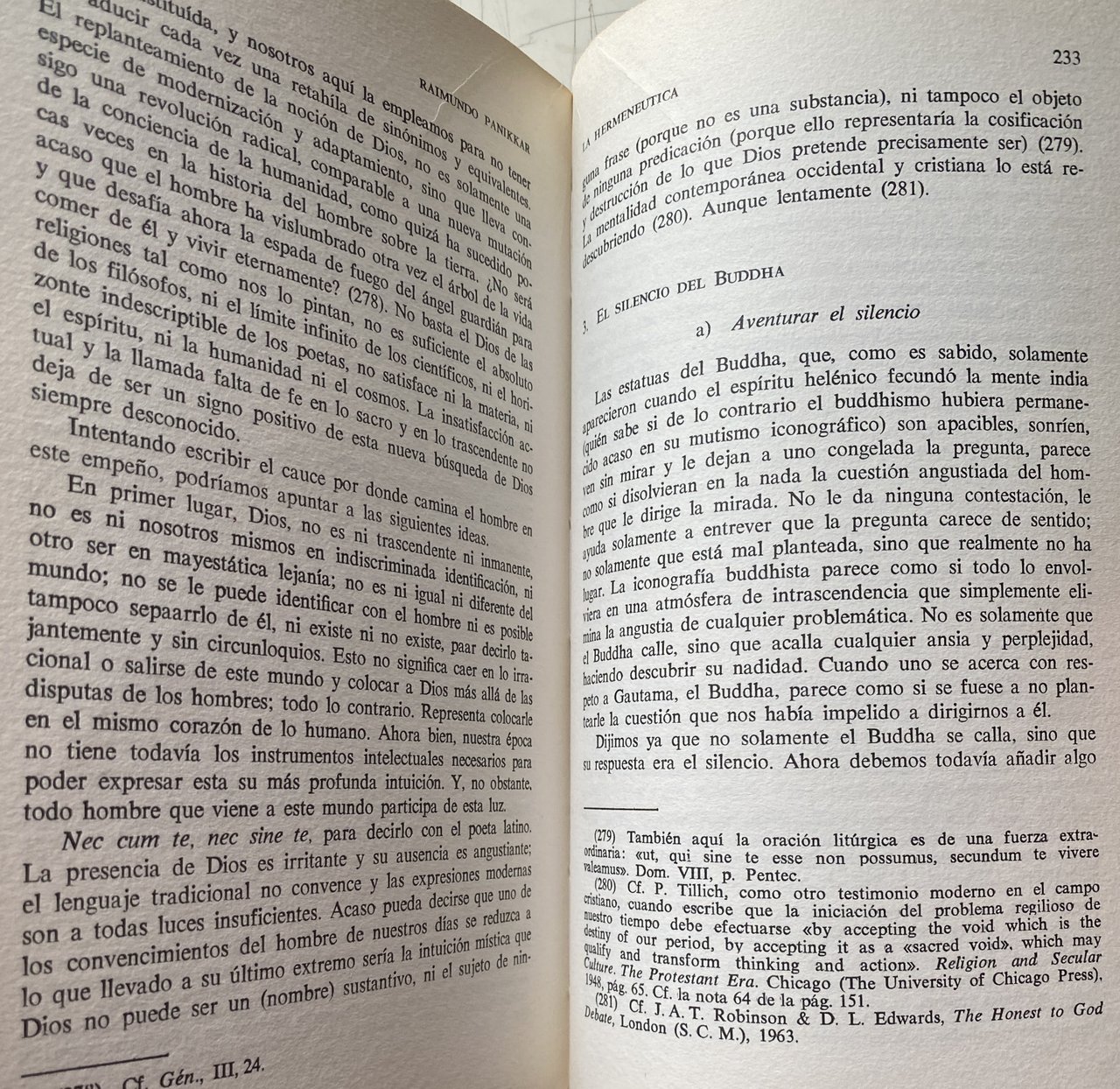 El mundo moderno ha amanecido con el denso nubarrón del ateísmo sobre su cenit. Es el problema radical profundo, ineludible, del hombre actual. Lo que R. Panikkar se propone en este libro sobre el silencio del Dios es un proyecto de suma ambición. Aborda este problema candente del ateísmo con unos ojos nuevos y extraños para el Occidente: trata de aportar la savia nueva de la vieja sabiduría del Oriente, y ello sin perder las esencias más queridas del cristianismo y del planteamiento metafísico occidental. La síntesis que R. Panikkar consigue entre budismo y planteamiento filosófico-cristiano tradicional hacen de este libro una de esas obras decisivas que sólo aparecen de tarde en tarde y que llegan a hacer época.