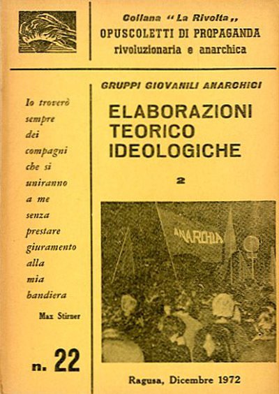 71 p. ; 17 x 12 cm. La "Rivolta", opuscoletti di propaganda rivoluzionaria e anarchica. Pamphlet di propaganda anarchica con testi teorici di organizzazioni giovanili anarchiche italiane. Libro edito nel dicembre 1972. Brossura editoriale, coperta illustrata in b/n in cartoncino flessibile colorato (giallo). All'interno nella seconda e terza di copertina alcune immagini in b/n. In prima pag. timbro ex libris. Codice libreria 2703.