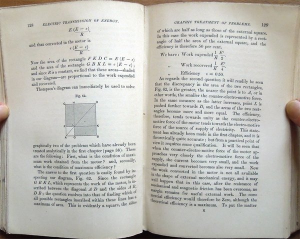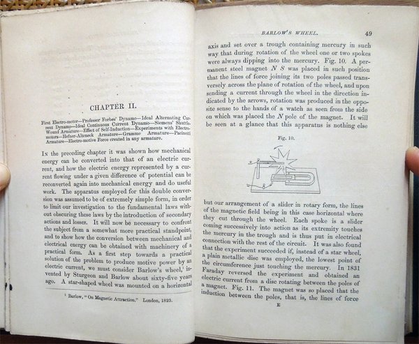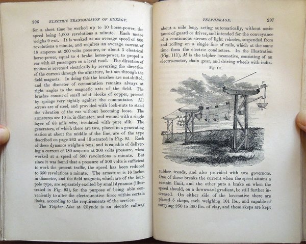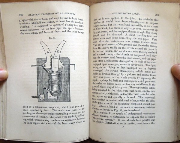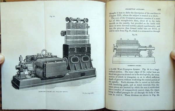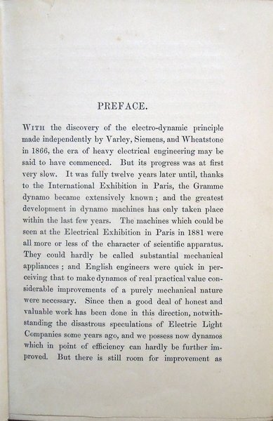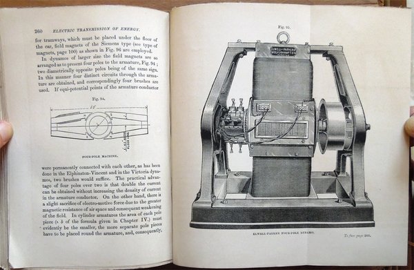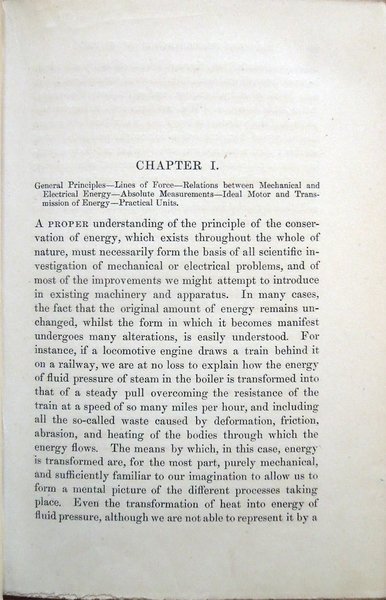 In-16° (19 x 12,3 cm), pp. XI, (1), 331, (1), 4, legatura editoriale, con titoli in oro al dorso e fregio della collana "The Specialists' Series" al piatto anteriore. Nella parte superiore del dorso, nel bordo esterno, lato piatto posteriore, piccolo strappo, di 0,9 cm. Con 119 figure in bianco e nero nel testo, alcune delle quali ospitate su tre tavole ripiegate. Nell'angolo inferiore interno del contropiatto anteriore, piccola etichetta della Hoepli di Milano. Qualche leggero segno d'umido alle carte di guardia, all'occhietto e a poche pagine. A pagina 200, piccola macchia di inchiostro, di 0,3 x 0,8 cm, con testo che rimane leggibile. Un piccolo strappo nel margine superiore del foglio con le pagine 243-244 e due in quello inferiore dei fogli con le pagine 281-282 e 283-284, tutti lontano dal testo e senza perdite, ben rimarginati con carta giapponese. Per il resto, esemplare ben conservato, parzialmente intonso. Nella collana "The Specialists' Series". Edizione originale - Prima edizione - Original Edition - First Edition. Contents: Introductory. Chapter I. General Principles - Lines of Force - Relations between Mechanical and Electrical Energy - Absolute Measurements - Ideal Motor and Transmission of Energy - Practical Units. Chapter II. First Electro-motor - Professor Forbes' Dynamo - Ideal Alternating Current Dynamo - Ideal Continuous Current Dynamo - Siemens' Shuttle-Wound Armature - Effect of Self-Induction - Experiments with Electro-motors - Hefener-Alteneck Armature - Gramme Armature - Pacinotti Armature - Electro-motive Force created in any Armature. Chapter III. Reversibility of Dynamo Machines - Different conditions in Dynamos and Motors - Theory of Motors - Horse-power of Motors - Losses due to Mechanical and Magnetic Friction - Efficiency of Conversion - Electrical Efficiency - Formulas for Dynamos and Motors. Chapter IV. Types of Field Magnets - Types of Armatures - Exciting Power - Magnetic Circuit - Magnetic Resistance - Formulas for strength of Field - Single and Double Magnets - Difficulty in Small Dynamos - Characteristic Curves - Horse-power Curves - Speed Characteristics - Application to Electric Tramcars - Static, Dynamic, and Counter-Electro-motive Force. Chapter V. Graphic Treatment of Problems - Maximum External Energy - Maximum Theoretical Efficiency - Determination of best Speed for Maximum Commercial Efficiency - Variation of Speed in Shunt Motors - The Compound Machine as Generator - System of Transmission at Constant Speed - Practical Difficulty. Chapter VI. Classification of Systems according to Source of Electricity - Transmission at Constant Pressure - Motors mechanically governed - Self-Regulating Motors - Transmission at Constant Current - Difficulty of Self-Regulation - Motor for Constant Current made Self-Regulating -Application to Transmission over large Areas - Continuous Current Transformator - Transmission between two Distant Points - Loss of Current by Leakage - Theory - Commercial Efficiency - Conditions for Maximum Commercial Efficiency - Self-Regulation for Constant Speed - Practical Example. Chapter VII. The Line - Relation between Capital Outlay and Waste of Energy - Most Economical Size of Conductor - Formula for Maximum Current - Formula for Mean Current - Tables for Finding Most Economical Size - Heating of Conductor - Table for Rise of Temperature. Chapter VIII. Circuit for Electric Transmission - Circuits for Electric Distribution - Relative Importance of Insulation - Aërial Lines - Insulators - Attachment of Conductor to Insulator - Joints - Couplings - Material for Aërial Lines - Estimate for Aërial Line - Protection from Lightning - Underground Lines - Edison Mains - The Three-Wire System - Various Systems of Underground Conduits - Lead-Covered Cables. Chapter IX. Possible Applications of Electric Transmission of Energy - Best Field for it is Long Distance Transmission - Comparison with other Systems - Herr Beringer's Investigation - Hydraulic Transmission - Pneumatic Transmission - Wire-Rope Transmission - Comparative Tables of Efficiency and Cost - Practical Conclusions. Chapter X. Classification of Dynamo Electric Machines - The Edison Dynamo - The Edison-Hopkinson Dynamo - The Thomson-Houston Dynamo - The Immisch Motor - The Manchester Dynamo - The Elwell-Parker Dynamo - The Elwell-Parker Motor - The Crompton Dynamo - The Goolden Trotter Dynamo - The Andrews Dynamo - The Kapp Dynamo - The Phoenix Dynamo - The Reckenzaun Motor - The Victoria Dynamo - The Gülcher Dynamo. Chapter XI. Historical Notes - Fontaine's Discovery - Figuier's Explanation - Early Patent of Pinkus - Early Electro-Motors - Page's Electric Railway - Ploughing by Electricity at Sermaize - Electric Cranes - Ventilating and Pumping by Electricity - Modern Electric Railways - Different Systems - Comparative Merits of Battery System and Conductor System - The Bessbrook-Newry Electric Railway - The Blackpool Electric Tramway - The Telpher Line at Glynde - Reckenzaun's Electric Tramcar - Comparative Estimates for Horse Traction and Electric Traction. Chapter XII. M. Marcel Deprez's Experiments - Palais de l'Industrie in 1881 - Munich in 1882 - Paris, Gare du Nord, in 1883 - Grenoble-Vizille, in 1883 - Paris-Creil, in 1885 - The Generator - The Motors - General Arrangement - Regulation of Motors - Starting of Motors - Stopping of Motors - Automatic Safrty Appliances. Titolo per esteso: Electric Transmission of Energy, and its Transformation, Subdivision and Distribution. A Practical Handbook by Gisbert Kapp, C. E., Associate Member of the Institution of Civil Engineers, Associate of the Society of Telegraph Engineers and Electricians.