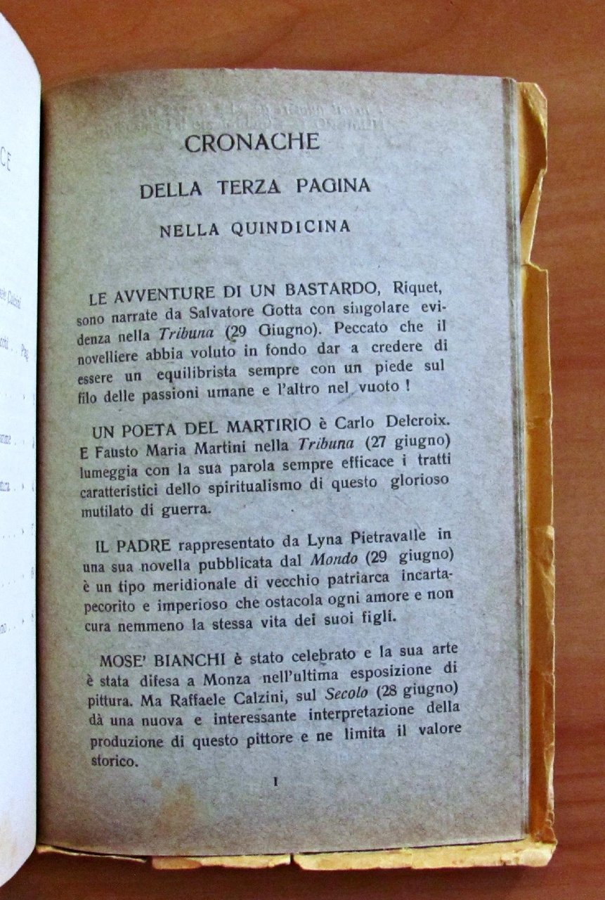 Collana La Terza Pagina. Ritratto dell'autore in b/n di G. Amisani. Roma - I edizione 1924.Brossura editoriale con lievi barbe al margine esterno della copertina. Traccia di vecchia gora d'acqua alla parte inferiore delle sole copertine. Contiene Cronache della Terza Pagina. Interno Come Nuovo. 10,5x15,5; pp.99. Buonissimo stato. , Molto buono (Very Good)