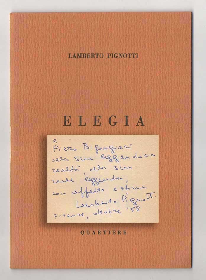 LIBRO Prima edizione. Ottimo esemplare. Secondo libro di poesie di Lamberto Pignotti dopo il poemetto ciclostilato «Odissea» del 1954 (ristampato nel 1994 da Fermenti). Ormai raro, il piccolo volume venne edito come estratto numero 1 della neonata rivista «Quartiere» fondata dallo stesso Pignotti con Gino Gerola, Giuseppe Zagarrio e Sergio Salvi nel 1958 e attiva fino al 1967. Sensibile alle voci emergenti della poesia italiana, il trimestrale vicino a posizioni marxiste si proponeva come punto d’incontro e di riflessione critica tra ragioni artistico-letterarie e impegno politico.