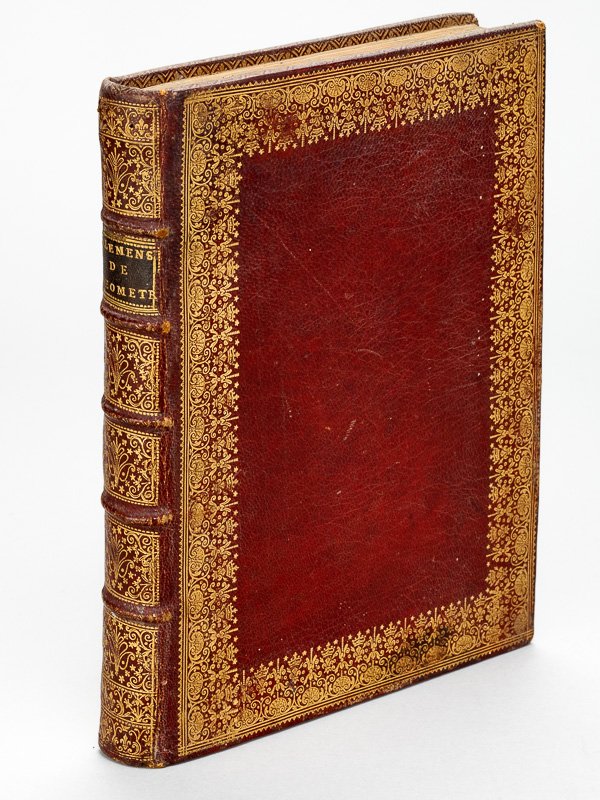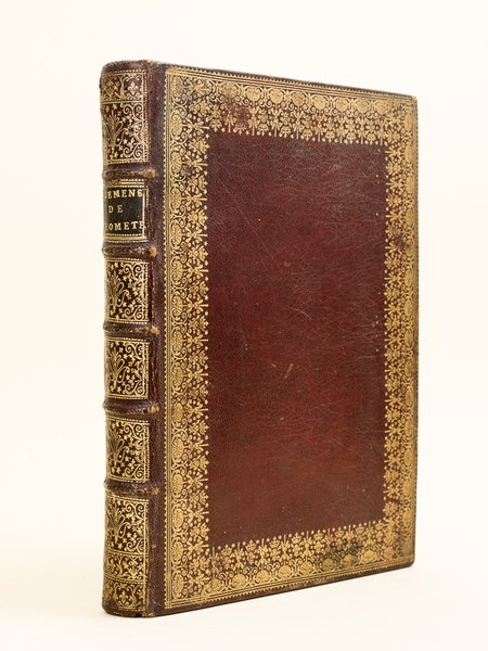 1 vol. in-4 reliure d'époque plein maroquin rouge, dos à 5 nerfs doré orné, large roulette d'encadrement aux plats, coupes et chasses ornées, toutes tranches dorées, texte manuscrit, 3 ff. blancs, 258 pp. et 1 f. blanc avec 25 planches dépliantes dessinées à la plume Rare manuscrit de géométrie en plein maroquin d'époque. Ce beau manuscrit de vulgarisation mathématique (vraisemblablement de la première partie du XVIIIe siècle) calligraphié avec soin contient 25 belles planches dessinées avec une superbe maîtrise (et souvent relevées par de beaux lavis). Contient : Traité des Proportions ; Livre I : Des Lignes tirées sur un plan ; Livre II : Des figures planes considérées par les lignes qui les bornent et qui sont tirées dedans ; Tome III : Des figures planes considérées par leurs superficies ou par l'espace qu'elles renferments ; Tome IV : De la rencontre des Lignes et des Planes ; Tome V : Des Corps en Général ; Tome VI : Des Corps ou des Figures solides considérées par leur solidité. Bon état (très petit travail de vers en coiffe sup., petit mq. de cuir au second plat).
