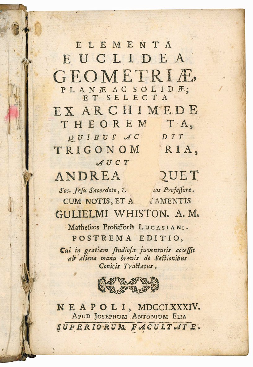 Elementa euclidea geometriae, planae ac solidae; et selecta ex Archimede theoremata, quibus accedit trigonometria, auctore [...] Cum notis, et additamentis Gulielmi Whiston. A. M. Matheseos professoris lucasiani. Postrema editio