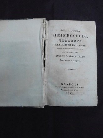 Neapoli, RAPHAELIS, 1833. Commoda auditorius methodo adornata. Cum notis sacerdotis Andreae Cantoris Amato. Longe auctior et castigatior. In 16∞: pp. 396. Leg. in mz. pergamena con titolo manoscritto al d. Fioriture sparse. "In quest`importante opera, che ebbe notevole successo in tutta Europa, il celebre giureconsulto espone la moderna teoria del diritto naturale e del diritto delle genti elaborata nell`ambito delle nuove prospettive etico-politiche che caratterizzavano la ricerca e la riflessione dell`illuminismo." J.G. Heineck latinizzato Heineccius (1681-1741)