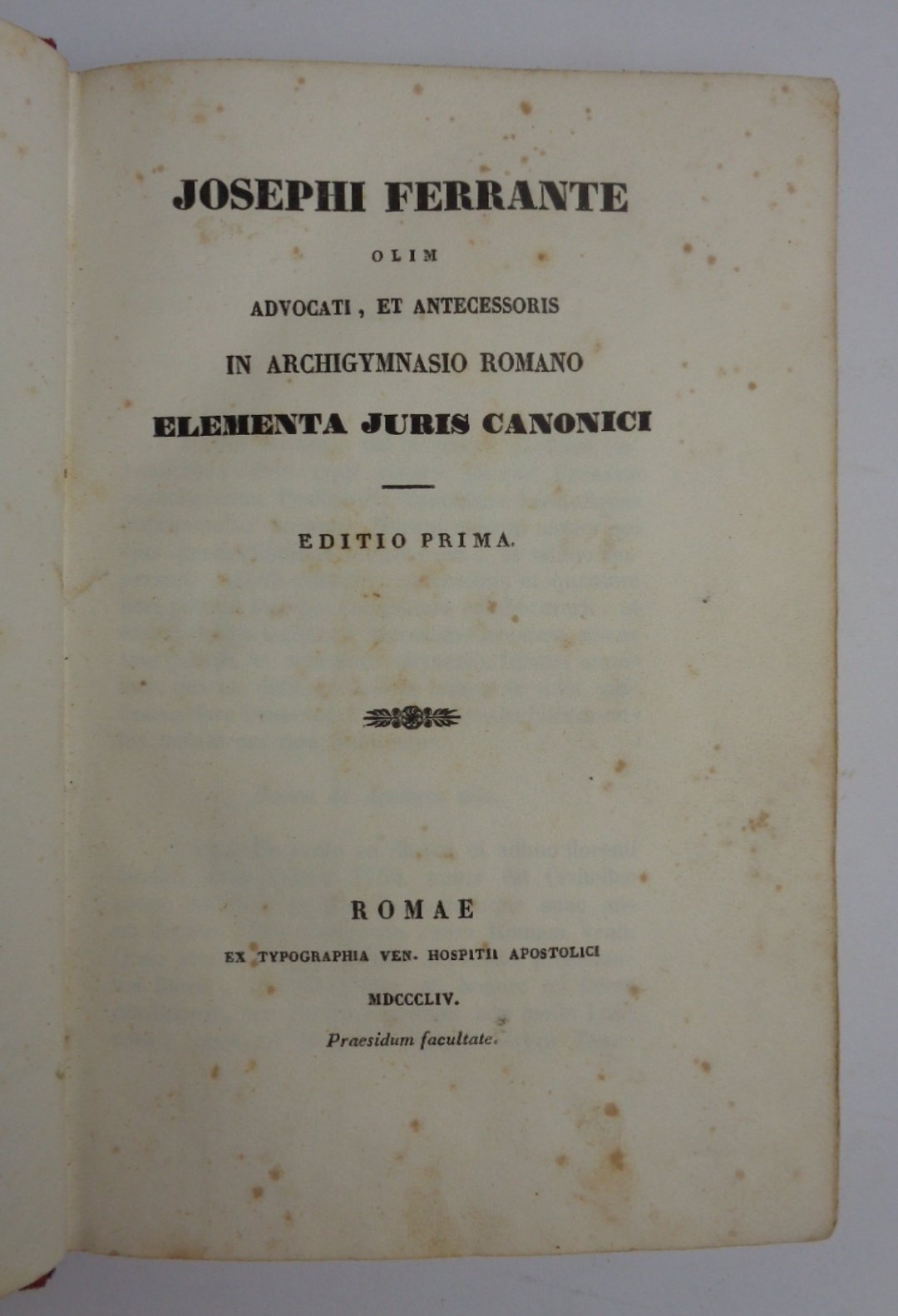 Un volume (22 cm) di V-185 pagine. In lingua latina. Fioriture sparse; alcune note a matita nel margine bianco. Modesta legatura coeva in tutta tela rossa, usure ai margini, titolo dorato al dorso, etichetta in coda. Prima edizione.