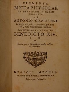 Elementa Metaphysicae mathematicum in morem adornata ab Antonio Genuensi In Regia Neapolitana Academi jam Ethices, nunc Oeconomices Professore. Sanctissimo Patri Nostro Benedicto XIV P.M.D. Editio quarta Neapolitana multo auctior & correctior. Neapoli, Ex Typographia Simoniana, 1760-1763.