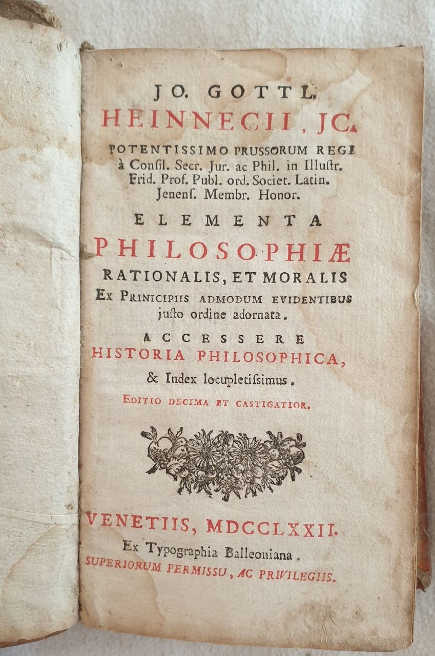 Edizione veneziana del 1772 di questa opera filosofica scritta da Johann Gotllieb Heinecke (1681-1741) noto giurista tedesco e professore ad Halle. L'opera è in un volume ed è completa. L'opera riguarda in particolare la storia della filosofia e la filosofia razionale e morale. In mediocri condizioni. Copertina in piena pergamena coeva con titolo manoscritto al dorso in discrete condizioni con usure e parti mancanti ai margini e dorso. Legatura in mediocri condizioni ma corpo del libro in parte staccato. Pagine in discrete condizioni con fioriture e lievi gore d'umidità marginali. In 16. Cm 16,5x9,5. Pp. 352. Venetian edition of 1772 of this phylosophical work written by Johann Gotllieb Heinecke (1681-1741) famous german jurist and teahcer in Halle. The work is in one volume and it is complete. the work relates in particular the history of phylosophy and rational and moral phylosophy. In poor conditions. Parchment cover with handwritten title in the spine in fair conditions with wearings and missing parts in the edges and spine. Binding in poor conditons but the body of the book partially detached. Pages in fair conditions with foxings and light dump stains in the edges. In 16. Cm 16,5x9,5. Pp. 352.