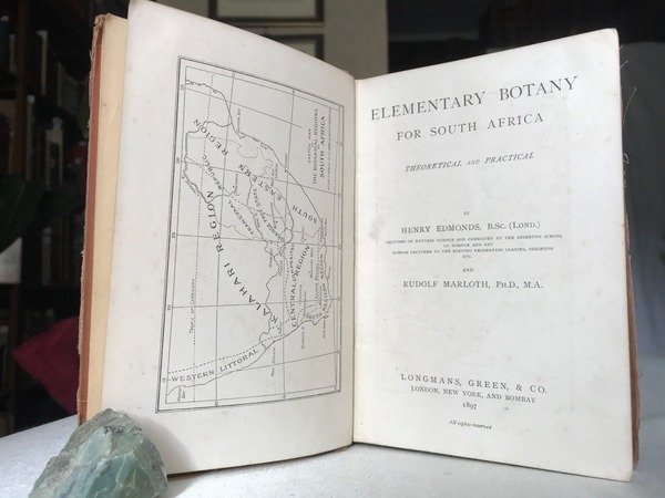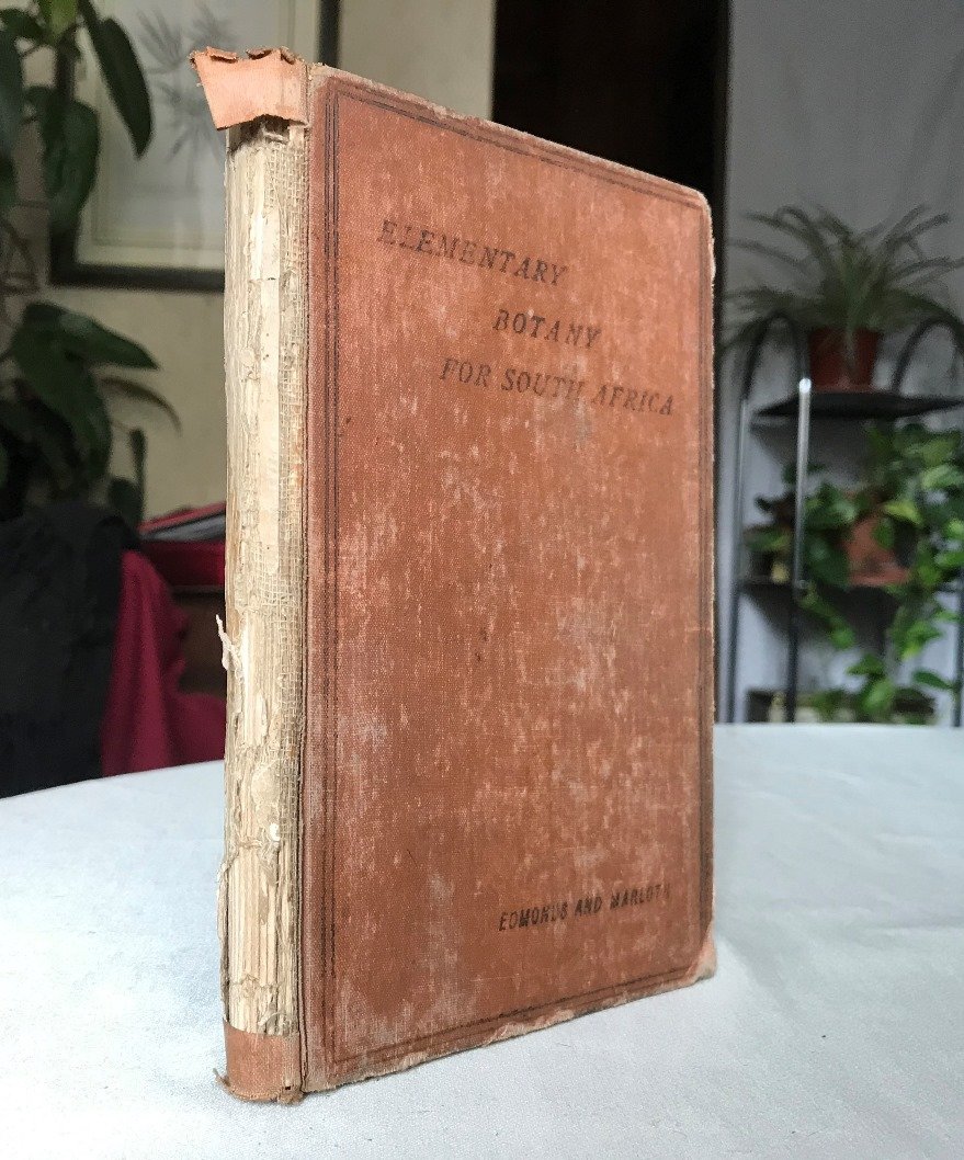 Volume in 8, legato in tela editoriale (dorso mancante), titolo al piatto, sguardie, tavola dantiporta con la mappa delle Regioni del Sud Africa, frontespizio, prefazione, sommario, carta derrata, (8) 208 pp., numerosissime (282) illustrazioni n.t. Interessante repertorio sulla vegetazione del Sud Africa, preceduto da una trattazione di botanica generale: struttura dei semi, germinazione, ramificazioni, innesti, strutture e funzioni dei fiori, frutti, semi, ecc., seguito dalla trattazione sulla vegetazione particolare per ogni regione del sud Africa, il tutto arricchito dalle numerosissime illustrazioni esplicative, da un elenco delle piante menzionate e da un indice dei termini usati. A parte le mende e mancanze alla legatura, il volume in bello stato, qualche piccola annotazione a matita, ben legato e fruibile. Particolare, interessante e davvero poco comune.