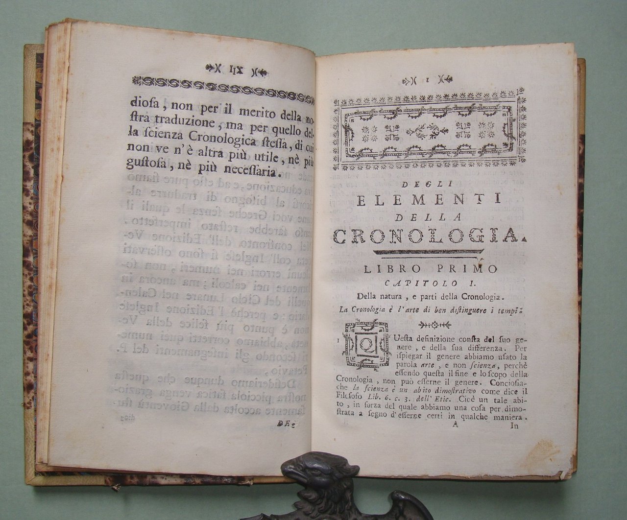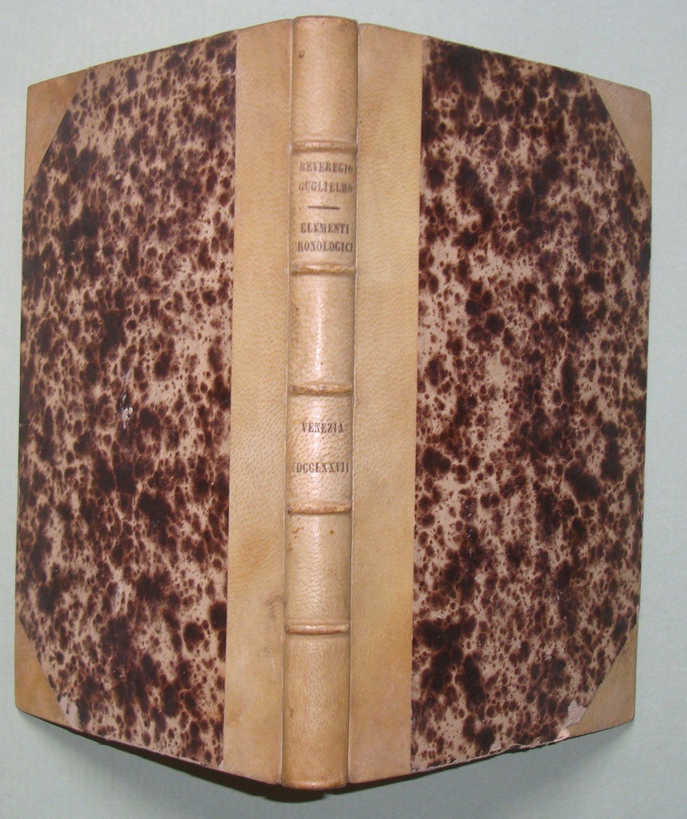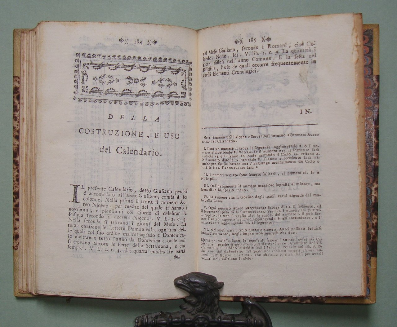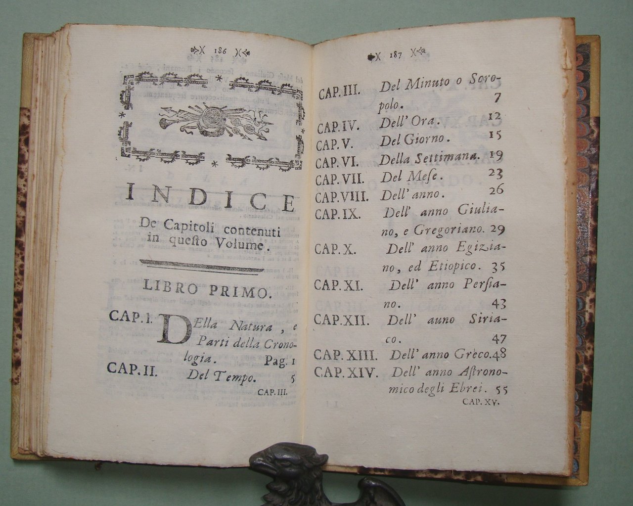 In Venezia, nella Stamperia di Giacomo Carcani, 1777. In 16mo; pp.XII,191. Mezza pergamena posteriore con angoli. Della cronologia, del tempo, del minuto o soropolo. L’anno Gregoriano, Persiano, Etiopico etc. Degli Equinozj e dei Solstizj, del Cielo e del Sole, le Eclissi, etc.